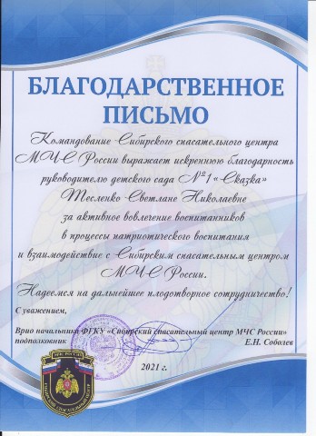 Благодарность 653 Спасательного Центра МЧС РФ за участие в праздничном концерте ко Дню Победы |