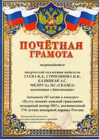 1 место в районном конкурсе "Пусть помнит каждый гражданин- пожарный номер 101", посвященный 370-летию пожарной охраны России |