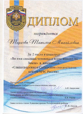 2 МЕСТО в конкурсе "Во имя спасения человека и всего живого на земле" в номинации "Стихотворение о Сибирском СЦ МЧС России