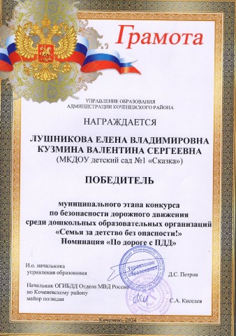 Победитель муниципального этапа конкурса "Семья за детство без опасности" . Номинация "По дороге с ПДД" |