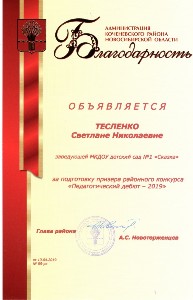 Благодарность руководителю за подготовку призера районного конкурса "Педагогический дебют-2019" |