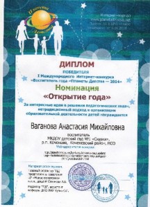 ДИПЛОМ ПОБЕДИТЕЛЯ 1 международного Интернет-конкурса "Воспитатель года "Планеты Детства -2014" Номинация "Открытие года" А.М.Ваганова |